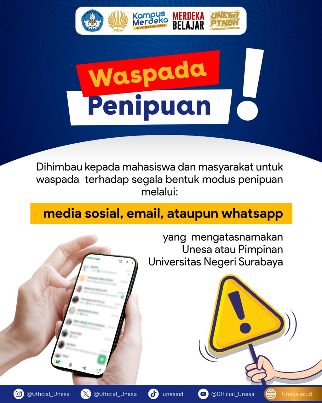 To All Academicians of Surabaya State UniversityIn order to increase awareness of various fraud modes that are increasingly common, we urge all students, lecturers, and staff to be